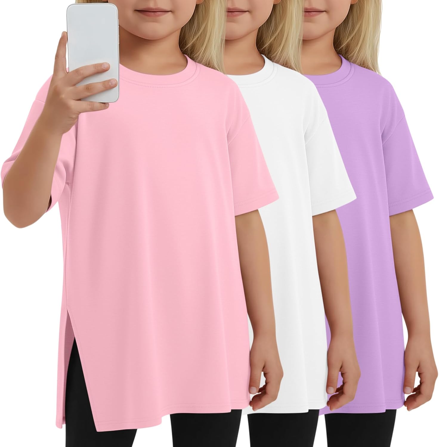 Features: Comfortable Fit: Our solid t-shirts for baby girls feature a knit fabric with a relaxed loose fit. The side slit detail enhances comfort while keeping a stylish look, making them suitable for daily wear and special occasions Easy Care: Machine and hand wash safe. Recommend to wash in cold water and tumble dry low or line dry Specifications: Material: 60% Polyester, 35% Cotton, 5% Spandex Package includes: 3 x Toddler girls' short sleeve shirts Notes: Manual measurement, please allow slight errors on size. The color may exist a slight difference due to different screen displays Please do not wash our products with other clothes, and bleaching is not allowed