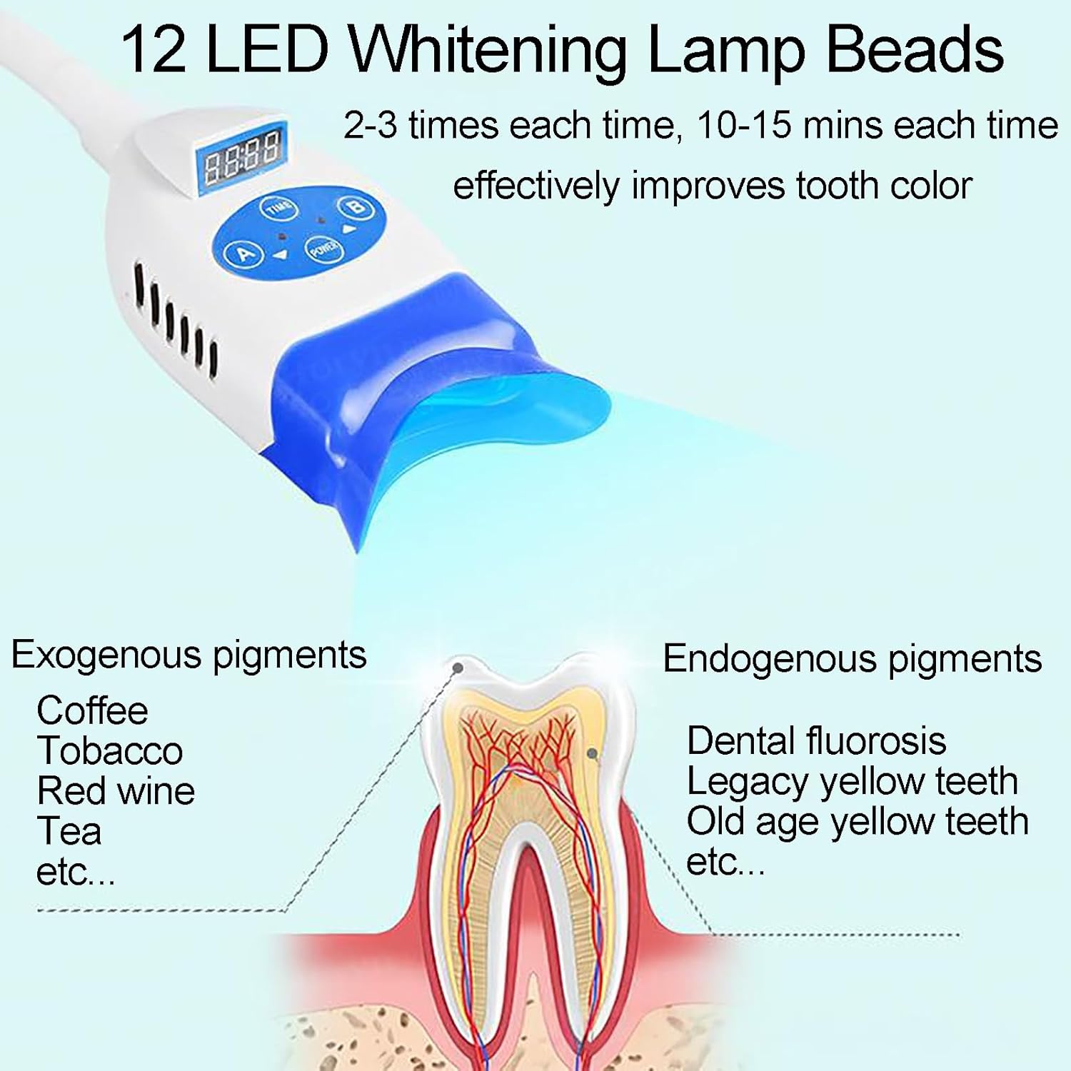 Feature:1. Two light intensities for your choice(High light intensity: 6000mw, low light intensity: 3000mw),which can suitable for most brands tooth whitening gel.2. Flexible gooseneck, adjustable angle, sturdy and durable, flexible and easy to use, convenient for operation at different angles.3. Unique semi-circular head design, both arches whitened at the same time.4. High power LED, fan-cooled. 12 LED lights5. 0-60 minutes adjustable timer, suitable for more brands tooth whitening gel.6. Led screen shows all the information. All the operation is so easy.7.There are three light modes: powerful blue LED tubes for blue light; powerful red LED tubes for red light; If you use all of 12 tubes at the same time, you will get new color.Specification:Input power: 100-240v, 50/60HzPower:50WNumber of lamp beads: 12power density:>6000MW/CM²Light timing: 0-60min<;1%WARNING: Please avoid blue light directly into people's eyes, please wear protective glasses to prevent blue light from hurting the eyes.If you need a longer work time, just restart it. But please pay attention to maintain good heat dissipation.