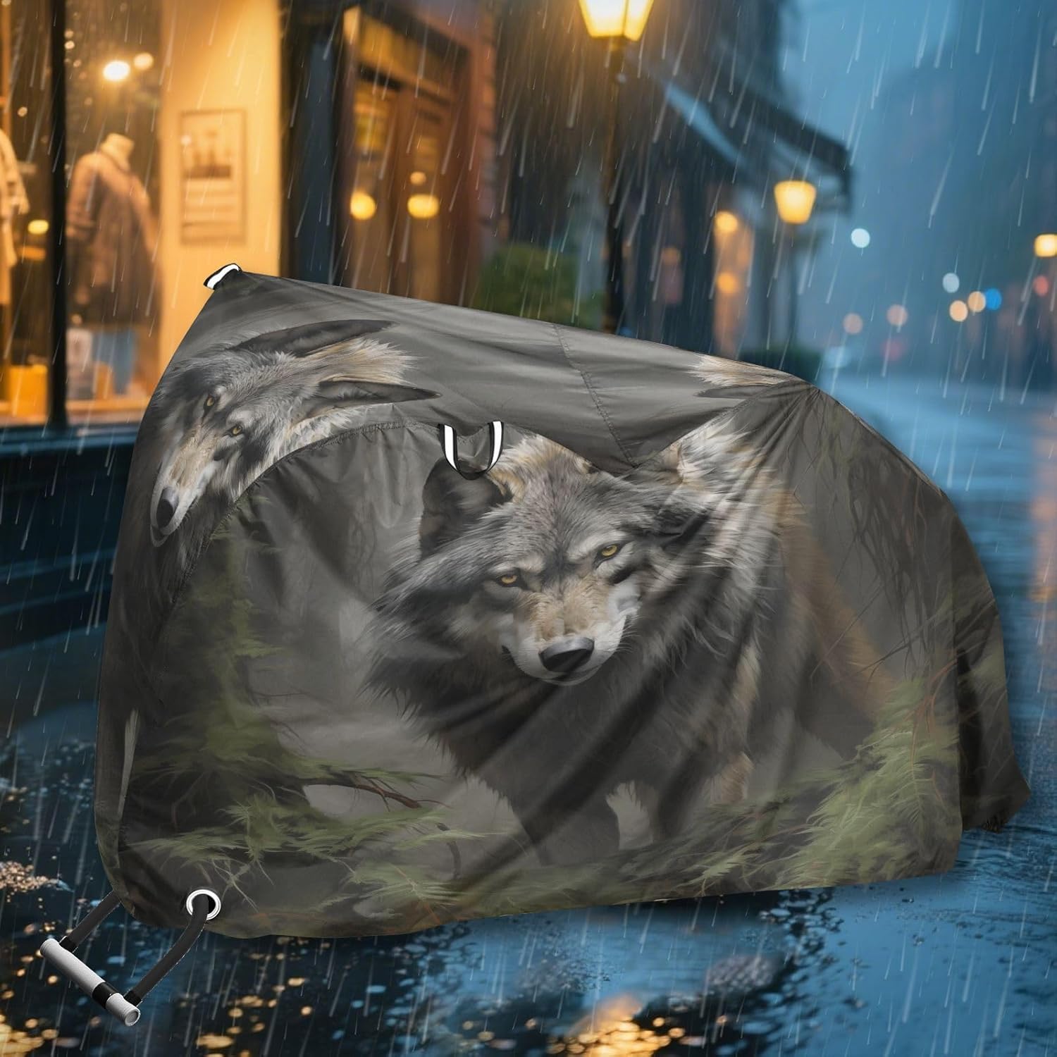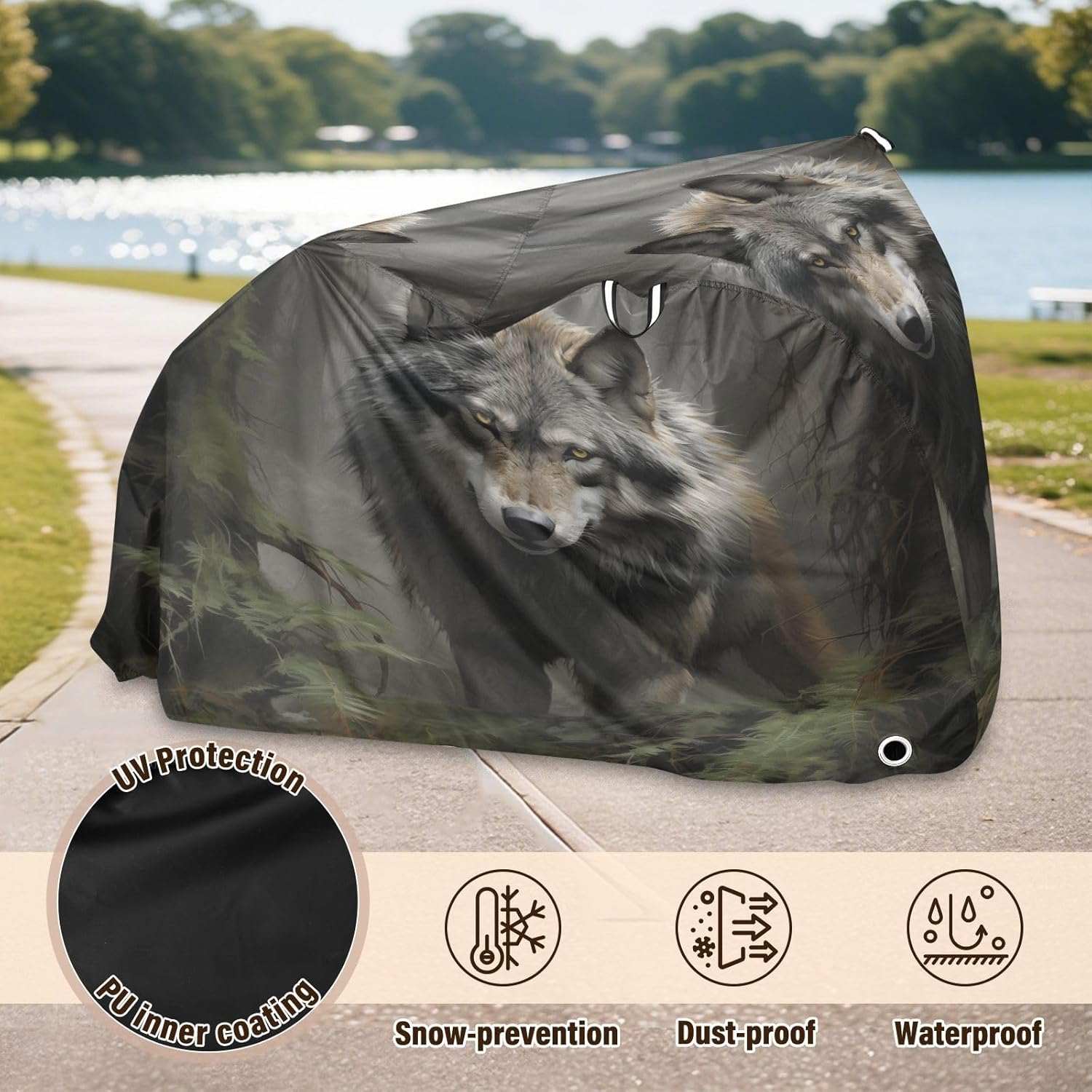 Protect your bicycle in style with our premium bike tarp, engineered for maximum defense against harsh elements. Unlike basic covers, we use specially engineered umbrella waterproof fabric - the same advanced material used in high-end rain umbrellas - delivering superior performance with unique visual appeal. Sun & Heat Defense Our fabric creates a physical cooling barrier that actively lowers your bike's temperature by: Blocking 95%+ harmful UV rays to prevent paint fading Providing exceptional shading & heat insulation (up to 20℉/11℃ reduction vs direct sun) Offering SPF 50+ equivalent protection for sensitive components Rain & Dust Protection Water-repellent coating causes rain to bead and roll off Tightly woven fabric acts as dustproof barrier for long-term storage Prevents moisture buildup with breathable side panels (prevents condensation) User-Focused Design LOCK ACCESS HOLE at front wheel enables secure locking without removing cover ADJUSTABLE BUCKLE STRAP at rear wheel anchors cover during strong winds Reflective safety strips on handles enhance nighttime visibility Ultra-lightweight (23 oz) folds into included pouch Unbeatable Aesthetics Choose from over 1,000 designer patterns - from sleek geometrics to vibrant nature motifs - transforming your bike into a street-style statement while competitors offer only solid colors.