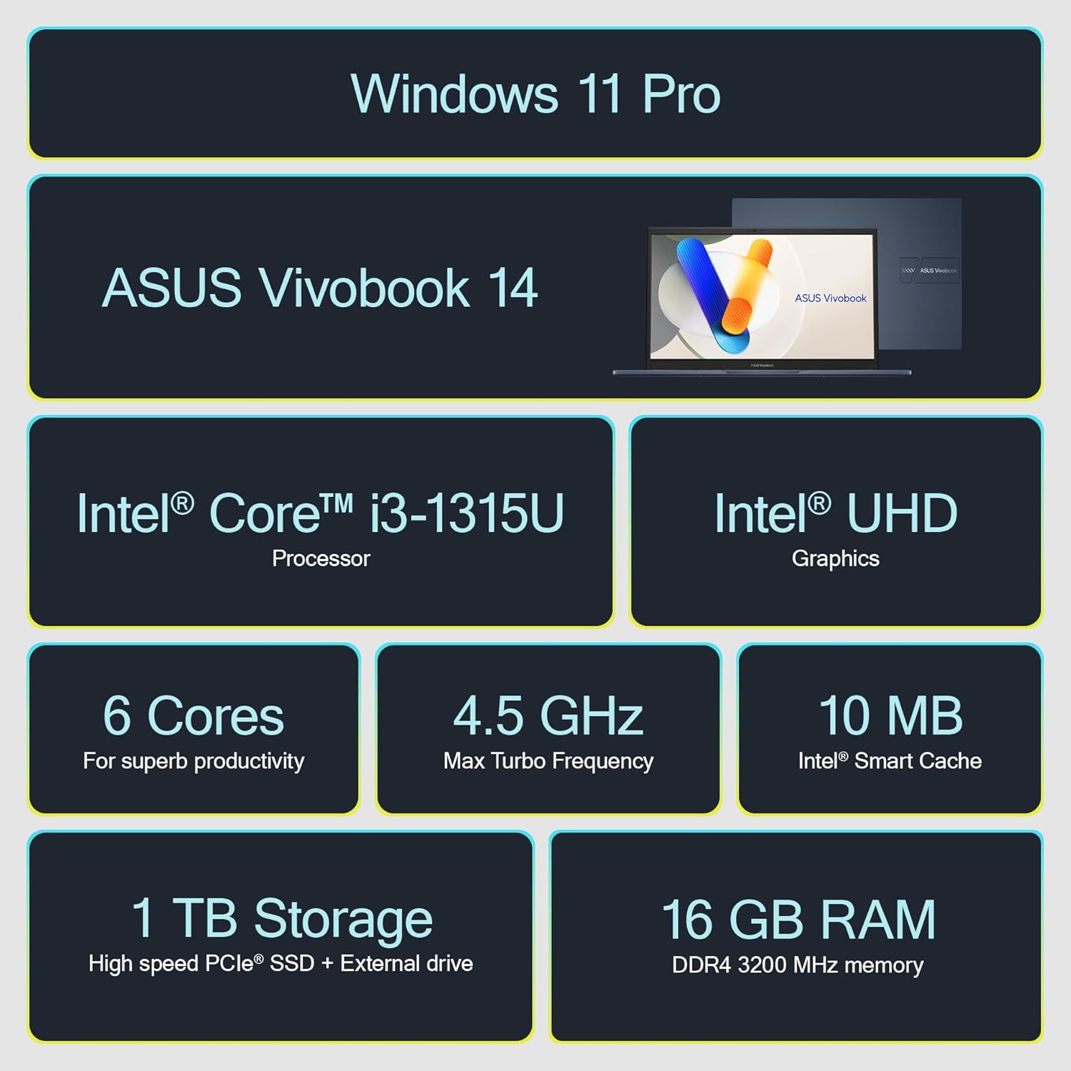 Make every task effortless with the 2025 Vivobook 14 — your go-to companion for productivity anywhere. Its user-friendly design features a 180° lay-flat hinge for flexibility and a physical webcam shield for added privacy. With ASUS Antimicrobial Guard Plus keeping touch surfaces cleaner, you can work safely and comfortably every day. Enjoy a smarter, more comfortable experience with the Vivobook 14.Operating System: Windows 11 ProSoftware: Lifetime Microsoft Office 2024Display: 14.0-inch, FHD (1920 x 1080) 16:9 aspect ratio, IPS-level Panel, LED Backlit, 60Hz refresh rate, 250 nits, Anti-glare display, TÜV Rheinland-certifiedProcessor: Intel Core i3-1315U (up to 4.50 GHz, 6 cores, 8 threads, 10MB Intel Smart Cache)Graphics: Intel UHD GraphicsMemory: 16GB DDR4 SDRAMStorage: 1TB (512GB NVMe SSD + 500GB Ext. Drive)Wireless Connectivity: Wi-Fi 5 + Bluetooth 5.1Keyboard: Chiclet Keyboard, 1.4mm Key-travel, Precision touchpad, support NumberPadWebcam: 720p HD camera with privacy shutterAudio: Built-in speaker and microphonePorts:1x USB 2.0 Type-A2x USB 3.2 Type-A Gen 11x USB 3.2 Type-C Gen 11x HDMI 1.41x 3.5mm Audio Combo JackBattery: 42WHrs, 3-cell Li-ionDimensions (L x D x H): 12.79 x 8.42 x 0.70 inchesWeight: 3.09 lbsColor: Quiet BlueAccessory: MarxsolAccessory (6-in-1 USB-C docking station hub, USB extension cord, HDMI cable, mouse pad, wireless mouse, and 500GB external drive)