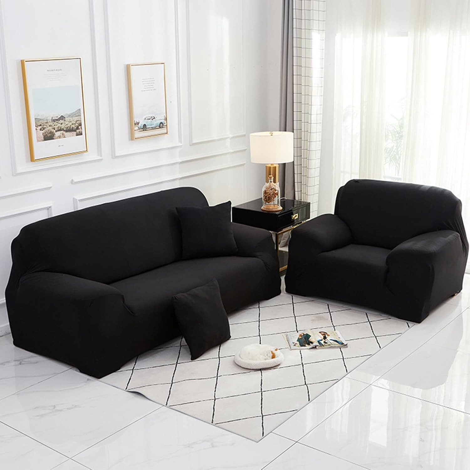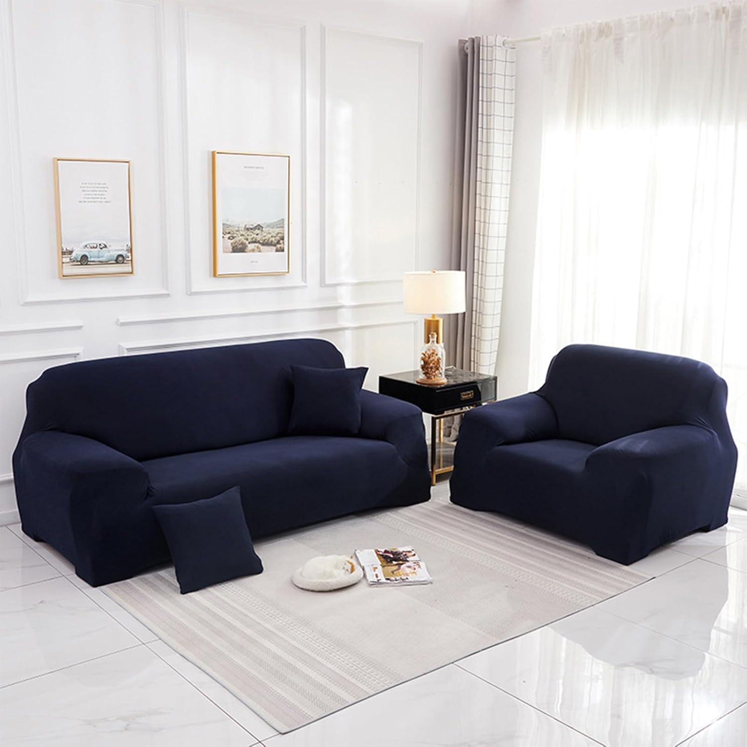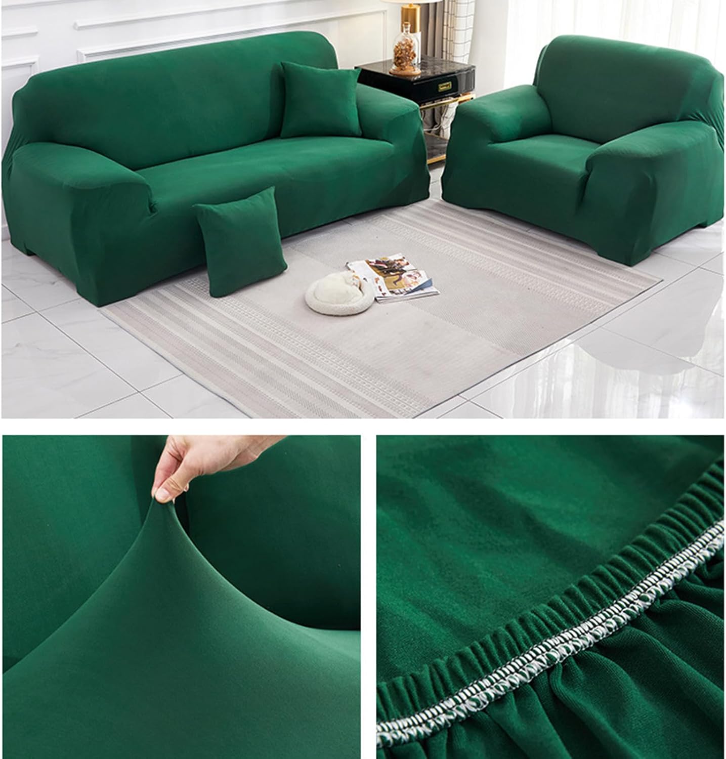 Product description: material: Polyester+Spandex Colour: Multi-colour available Size: details as shown, please read the buying guide carefully Season: All seasons Stylish Which can transform your old sofa to a new one or protect your new sofa. Great choice for homes with kids or pets. High Elasticity Great elasticity makes the cover suitable for many styles of sofa. The couch can be totally covered, ensures protection from daily wear and tears. Anti-Slip Foam Strips Anti-slip foam strips included in each package to help keep the couch cover stay in place better. Insert into the seams where is necessary. Easy to Care Machine washable for easy care and maintenance, separately in cold water on the gentle cycle. Do not bleach or iron. It is suggested to line dry. Warm Tips: 1.Please check the size and style of the product before purchasing. 2. We recommend buying a sofa cover that is slightly larger than the sofa bed. Since we manufacture our products by hand, there may be a deviation of approx. 1-3 cm. 3. Due to different computer display/screen, the color of the product may be slightly different from the picture. Scope of delivery: 1x Sofa Cover (no pillow)
