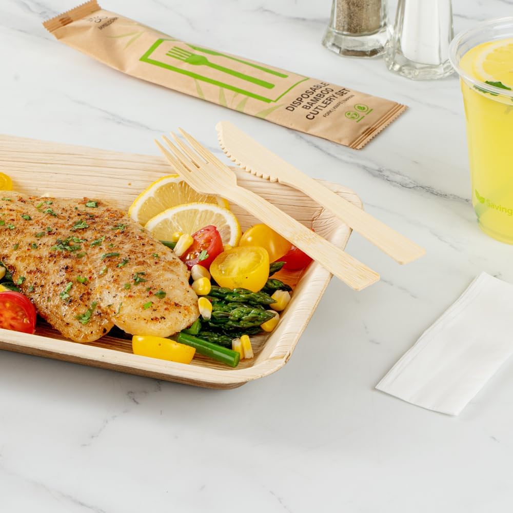 Create an elegant dining experience with our Bambuddha Bamboo Disposable Fork / Knife Set. These flatware sets consist of a fork, knife, and white napkin, inside a paper pouch to ensure your utensils stay without any unwanted substances. Made from sustainable bamboo, these disposable wooden cutlery sets are sustainably disposable and break down once disposed of. To ensure the fork and knife don't warp while enjoying meals, these bamboo cutlery sets can handle high temperatures. With a smooth finish, these travel cutlery sets make it easy to avoid splinters on fingers. For elevating your dining experience, these disposable utensils have a pleasing wood-grain finish. These bamboo utensils have a fork and knife that measure 7 inches long. Sold in a 100 count box.