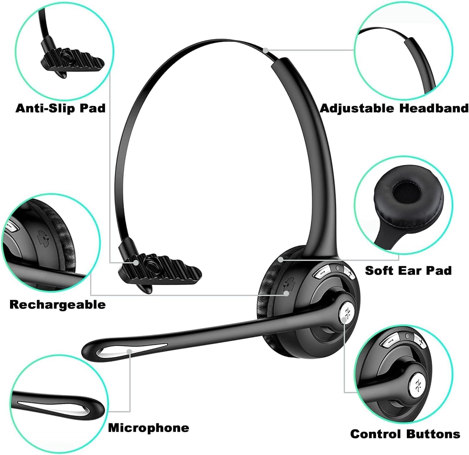 Professional Over-the-Head Driver's Rechargeable Wireless Bluetooth Headset with HD Microphone High sensitivity chip, it provides absolutely synchronous sound when listen to music and play video game. "Humane & Comfortable Design The Skin-friendly ear-cushion as well as the over-head and light-weight design gives you an ultra-fashion, comfortable experience. Rotatable Microphone and adjustable size make you wear perfectly and securely. Keep your Mic Mute by turning Microphone to protect your privacy anytime." "Extended Playtime Up to 12 hours of continuous talking/music time and up to 200 hours of standby with a single charge, Wherever your day takes you, don’t miss your calling." Specification: Bluetooth Range: Up to 33Ft (The transmission distance differs with environment factors and the bluetooth device of mobile phone) Charging Time: 2-3 hrs Talk Time: 12hrs Battery Capacity: 180mAh/3.7V,Charging via USB cable(Include) Warm Tip: Desk phone need support Bluetooth protocol HFP / HSP, whether it supports depends on cordless phone manufacturers, such as Motorola, Panasonic, Siemens etc. Please make sure support before you buy! For ATT CLP99387 Cordless telephone , please selected the Bluetooth Headset on the home phone's ''option'' settings. The MUTE function is disabled with SKYPE on the PC(iOS Window 10). This is not a headset problem, it is a third-party software problem on the computer.